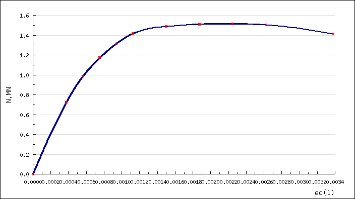 За результатами рішення систем рівнянь (4.1 - 4.2) будується діаграма «стискальна сила - деформація бетону найбільш стиснутої фібри». Найбільша величина зафіксована на цій діаграмі і приймається за несучу здатність. В разі, якщо визначена величина несучої здатності будє меншою за зовнішні впливи необхідно виконати зміну розмірів перерізу, армування або міцності бетону.